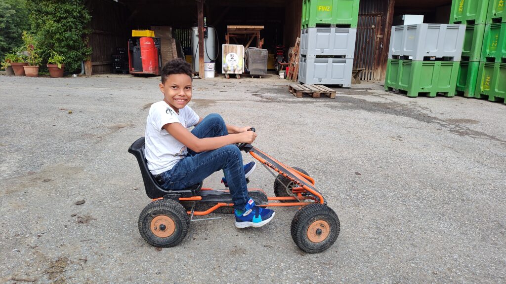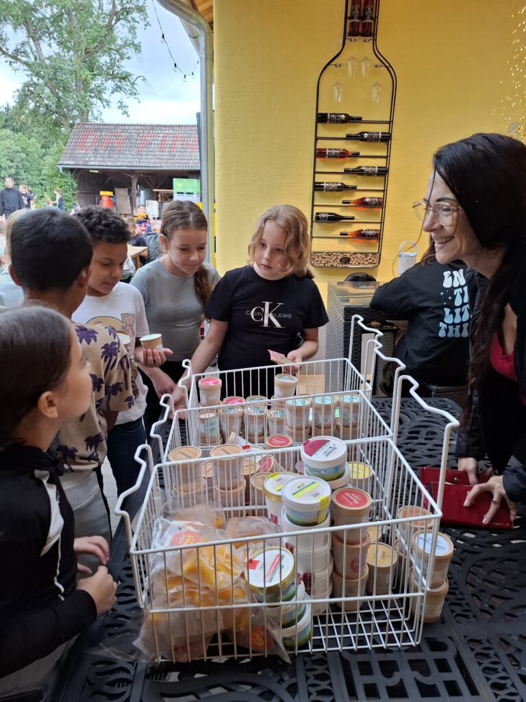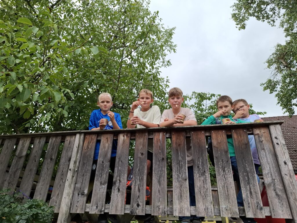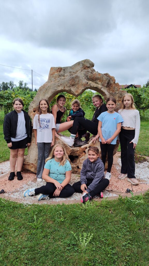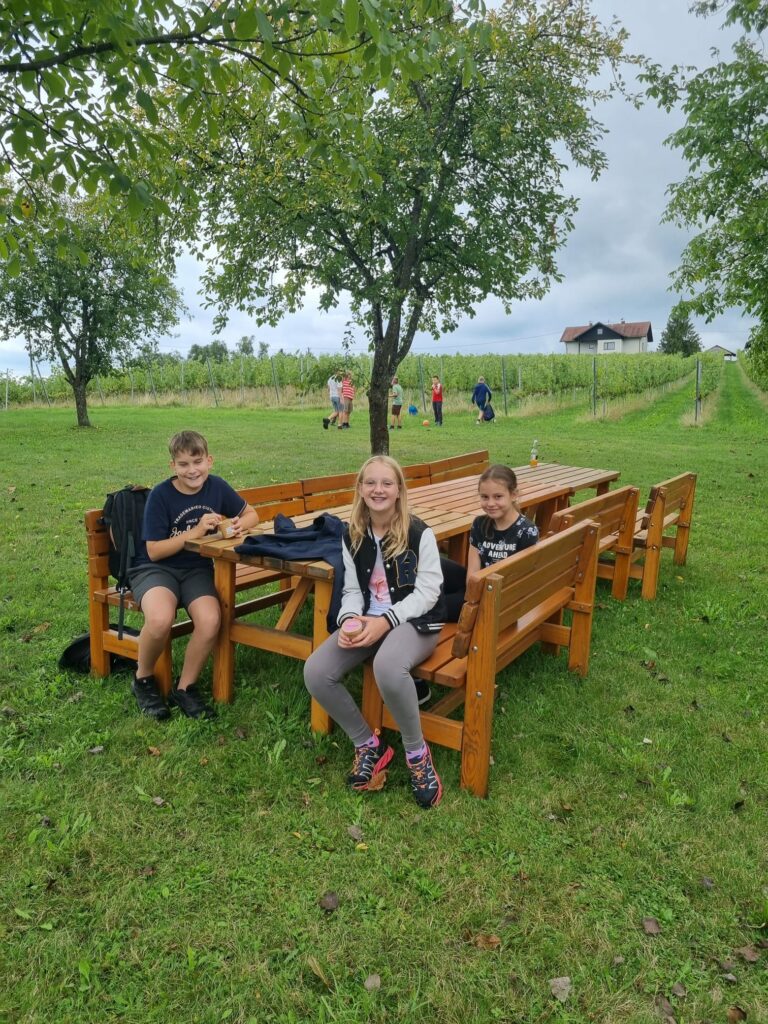 Als Höhepunkt der ersten Schulwoche machten die insgesamt 78 Erstklässler einen abwechslungsreichen Wandertag. Die Route führte durch Wald, Wiese und entlang der Straße bis zum Obsthof/Weingut DaFinz. Nach dem langen Marsch wurden wir dort herzlich empfangen und konnten uns mit Brötchen, Saft und einem erfrischenden Eis stärken. Für Unterhaltung war ebenfalls gesorgt: Die Schülerinnen und Schüler spielten Ball, schaukelten, streichelten die jungen Katzen oder verbrachten Zeit beim Kartenspielen.